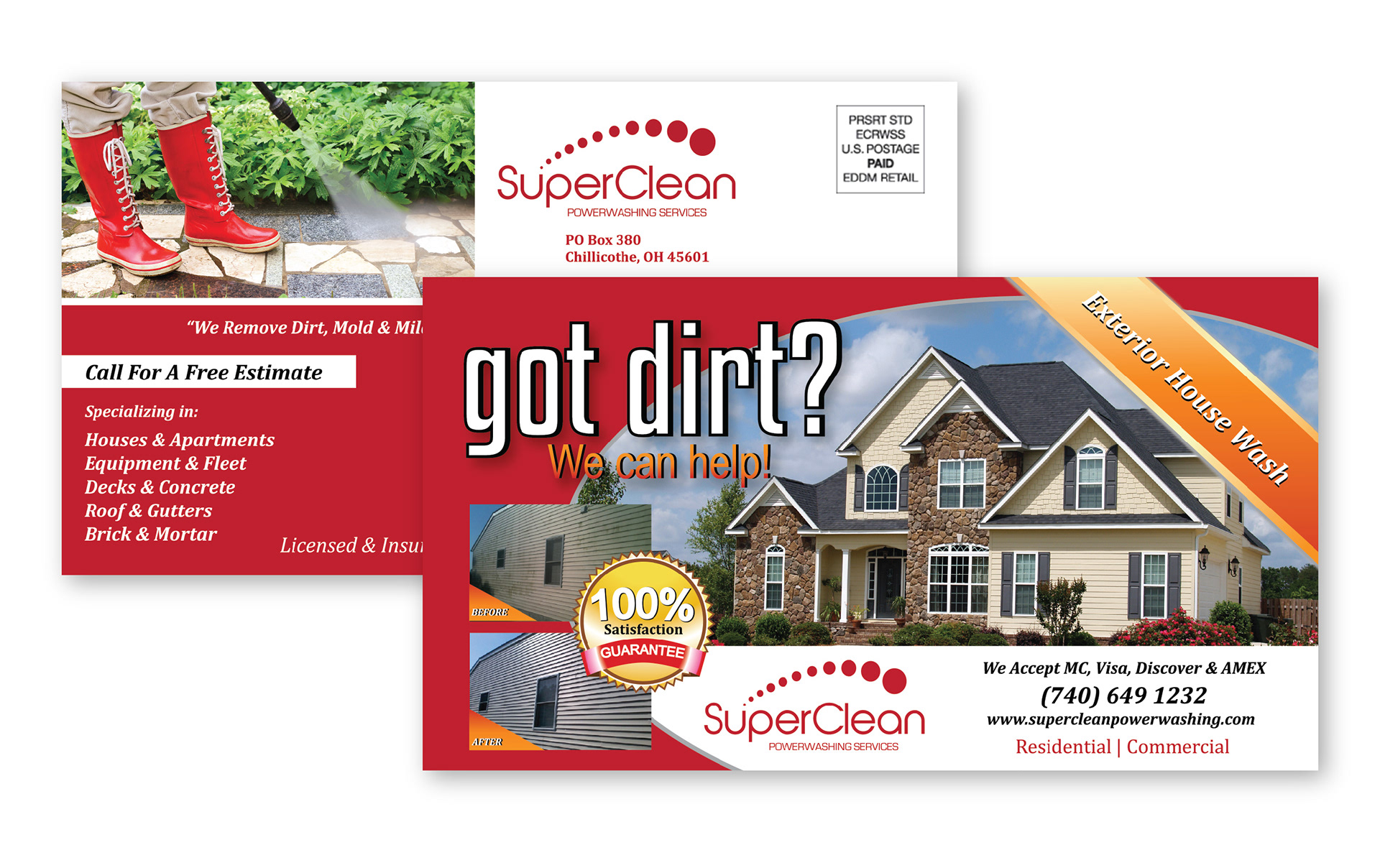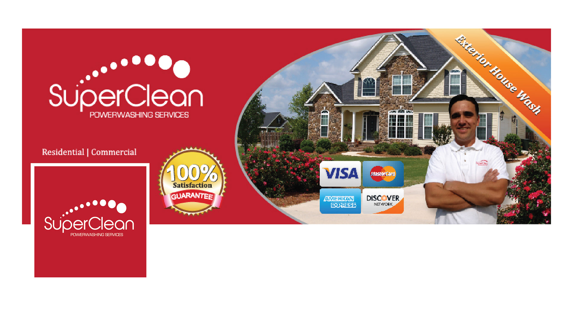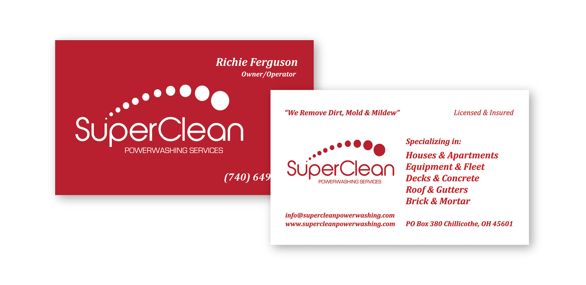 Corporate Identity, Direct Mail Postcard, Website, Door Hanger, Business Forms, and Workwear for SuperClean Powerwashing, LLC
