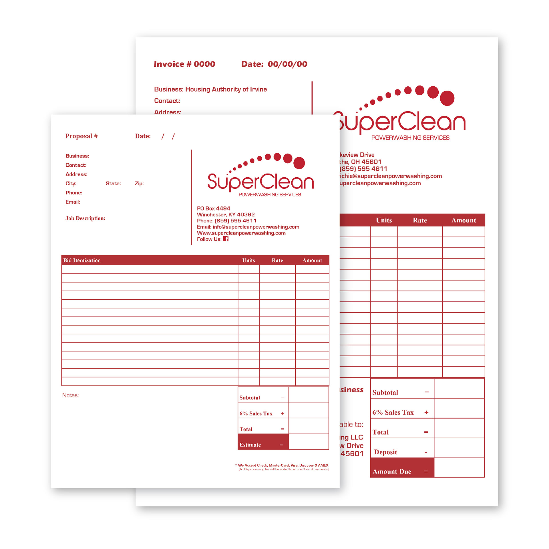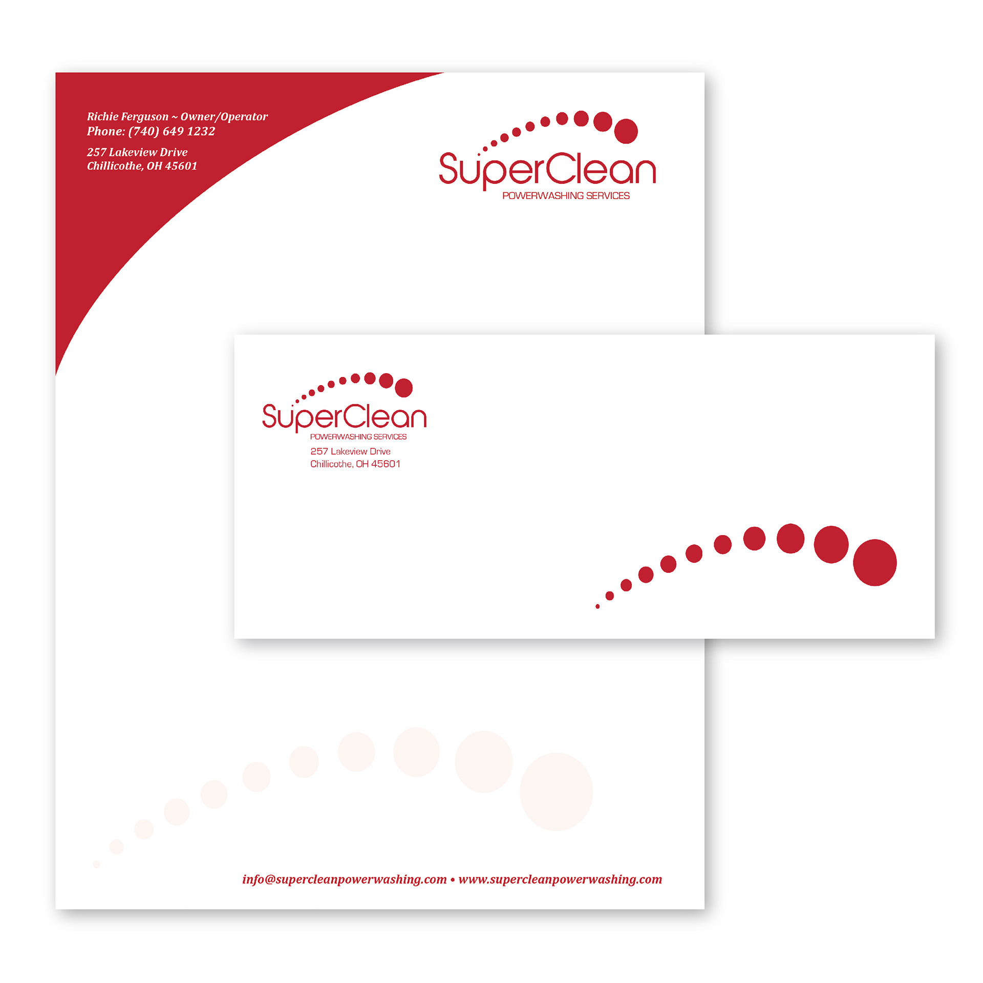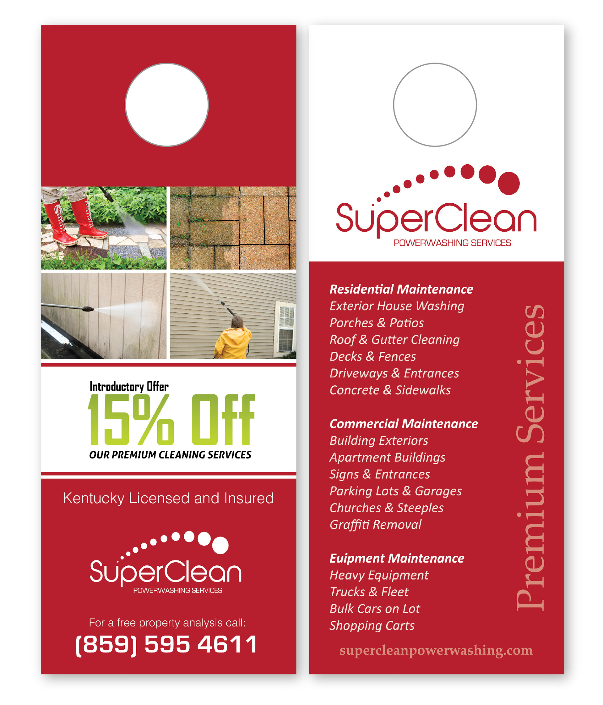 Corporate Identity, Direct Mail Postcard, Website, Door Hanger, Business Forms, and Workwear for SuperClean Powerwashing, LLC